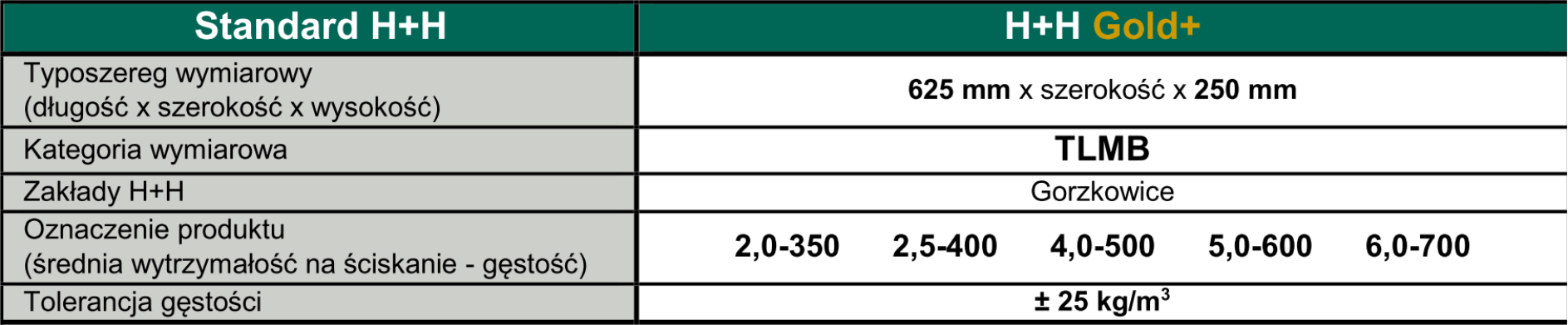 Bloczki H+H Gold+ to elementy ścienne wyprodukowane w najwyższej jakości. Najwyższa jakość oznacza najdokładniejsze tolerancje wymiarowe TLMB ± 1mm, wąski zakres tolerancji gęstości ± 25 kg/m3 (charakterystyczny dla wysokiego reżimu produkcyjnego), wyposażenie bloczków w uchwyty i system pióro-wpust oraz największe wytrzymałości na ściskanie w odpowiednich klasach gęstości.